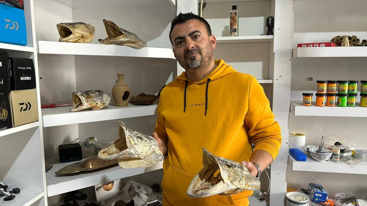 Niğde’de balık av malzemeleri satışı yapan Zübeyir Doğan, çocukluk yıllarında başlayan balık tutma merakını iş yaşamına taşıdı. Yaklaşık 10 yıldır sektörde yer alan Doğan, avladığı dişli ve avcı balıkların kafalarını mumyalayarak iş yerinde dekor olarak sergiliyor.