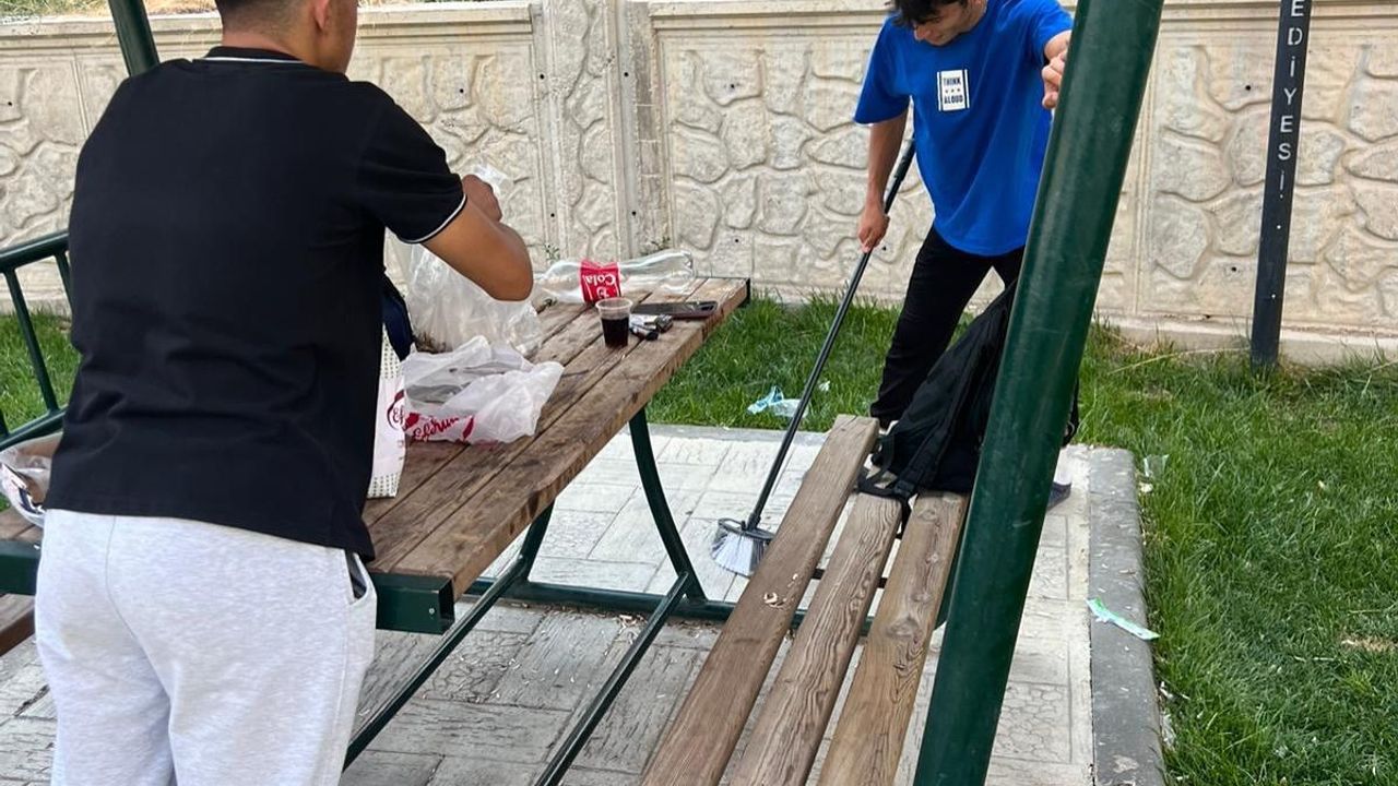 Niğde’de Dutlu Park’ta oturdukları alanı kirli bırakan gençler, Zabıta Müdürlüğü ekiplerinin uyarısı üzerine çöpleri topladı.