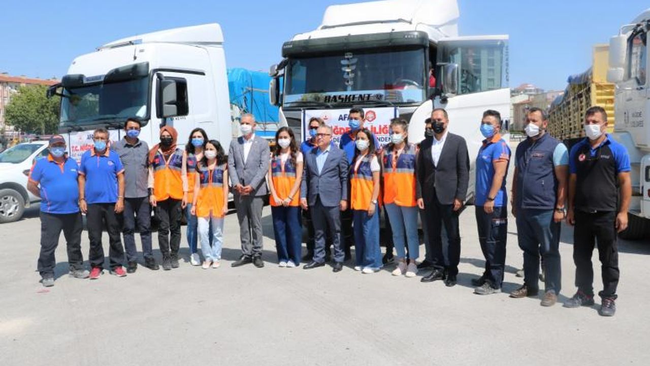 NİĞDE Valiliği tarafından Karadeniz'de yaşanan sel felaketinin ardından selzedelere 3 tır yardım gönderildi. Valilik koordinesinde başlatılan yardım kampanyasında toplanan 3 tır yaşam malzemesi düzenlenen törenle sel bölgesine doğru yola çıktı. 5 Şubat stadyumu alanındaki uğurlama töreninde konuşan Niğde Valisi Yılmaz Şimşek: ' 3 tır yardım malzemesini batı Karadeniz sel bölgesine gönderiyoruz. ,çerisinde temizlik gıda giyim gibi yardım malzemele