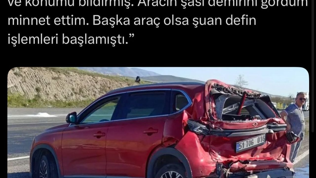 Sürücünün sosyal medya paylaşımı ise şu şekilde, ''Togg kaza sonrası hemen 112'yi aratıp kazayı ve konumu 112'ye bildirmiş. Aracın şasi demirini gördüm minnet etti. Başka araç olsa şuan defin işlemleri başlamıştı' mesajına yer verdi.