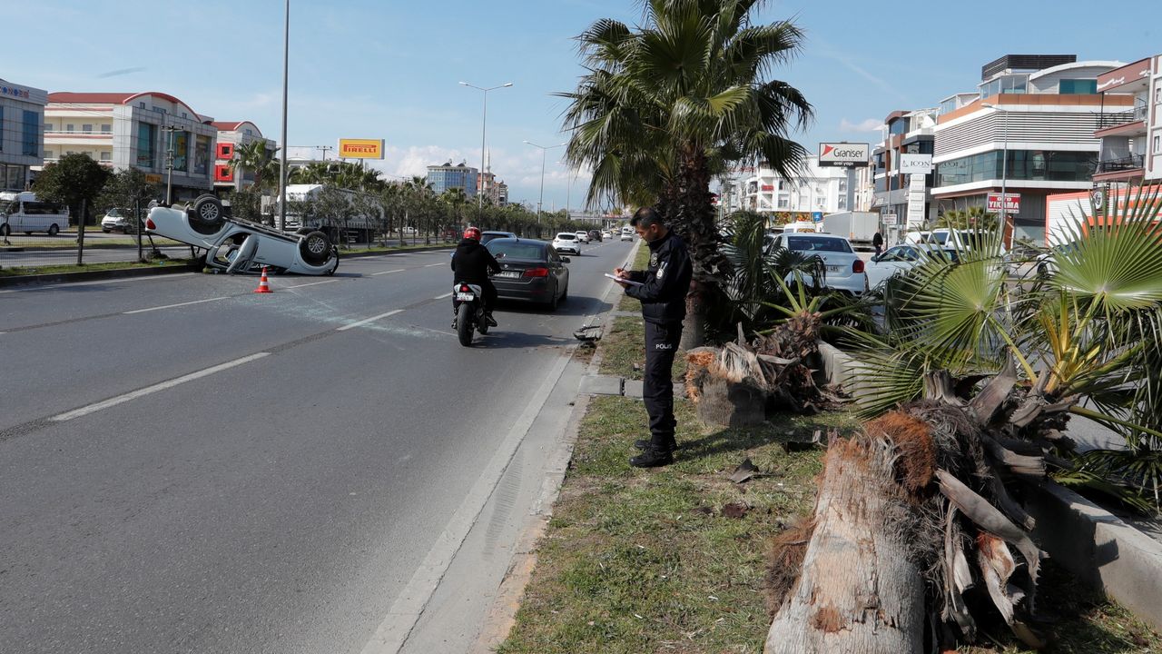 Antalya'da direksiyon hakimiyetini kaybeden sürücü yol kenarındaki palmiyelere çarparak takla attı. Araçta sıkışan sürücüyü itfaiye ve sağlık ekipleri bulunduğu yerden çıkardı.