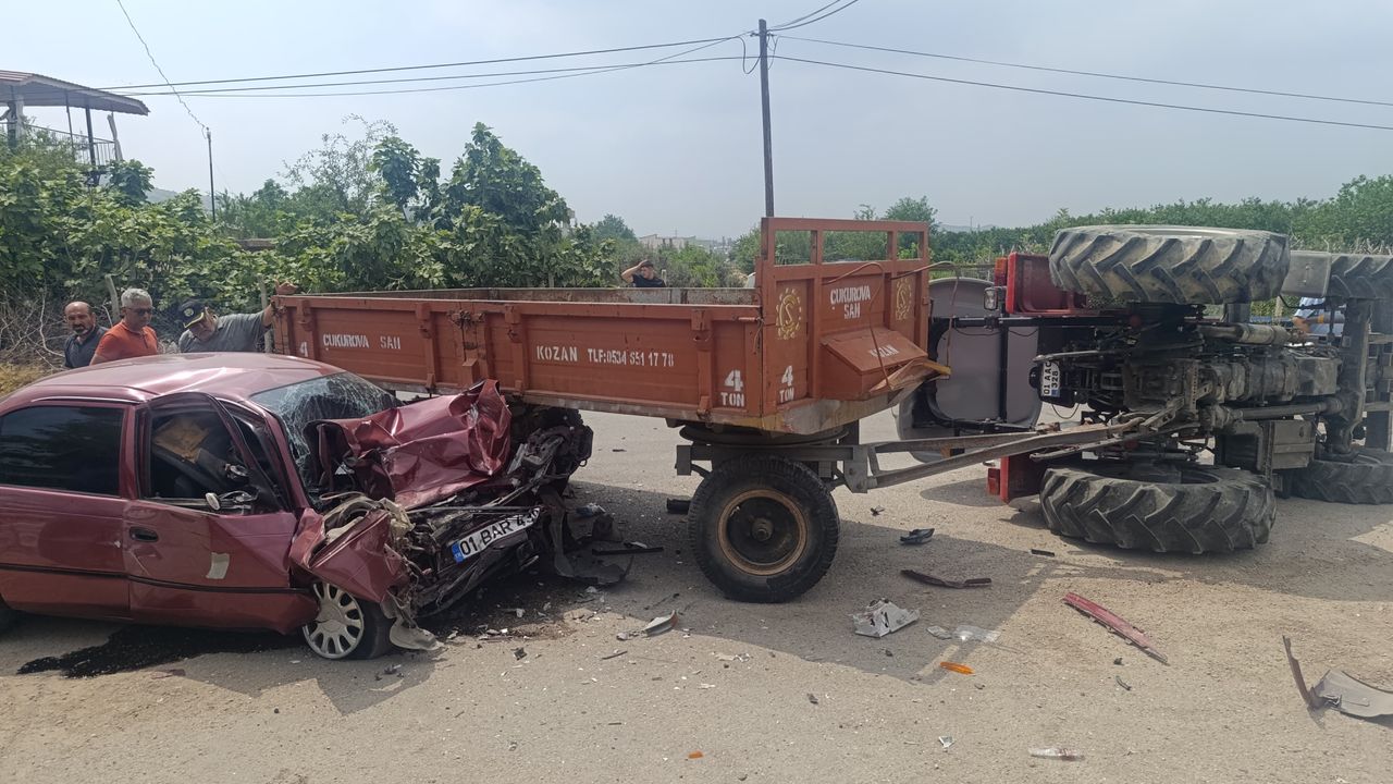 Adana'nın Kozan ilçesinde otomobille çarpışan traktör devrildi, 2 sürücü de yaralandı.