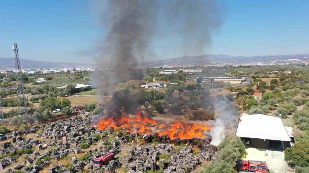 Manisa’nın Yunusemre ilçesindeki ahşap palet fabrikasındaki yangına itfaiye ekiplerinin müdahalesi devam ederken yangının büyüklüğü havadan görüntülendi.