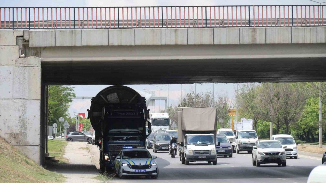 Eskişehir’de taşınan rüzgâr türbinin kanadı, üst geçide sıkıştı.