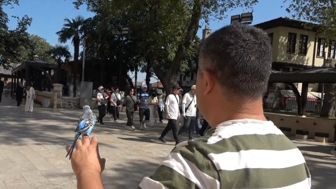 Merkez Osmangazi ilçesindeki tarihi Emir Han’da berberlik yapan Murat Tekin’in en yakın dostu, Müdür ismini verdiği muhabbet kuşu.