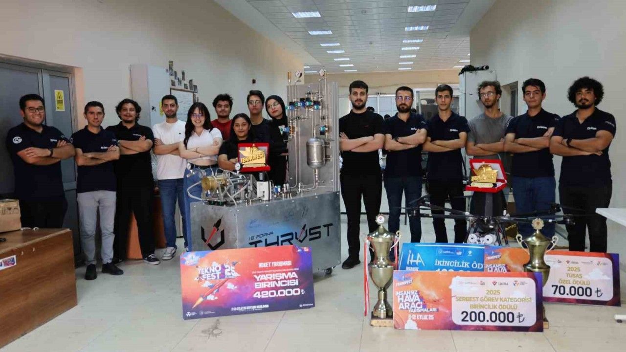 8-12 Eylül tarihlerinde Kocaeli Cengiz Topel Havalimanı’nda düzenlenen TEKNOFEST 2025 kapsamında gerçekleştirilen yarışmada, Çukurova Üniversitesi Makine Mühendisliği Bölümü’ne bağlı olarak faaliyetlerini sürdüren 1.5 Adana İHA Takımı, Uluslararası İnsansız Hava Aracı Yarışması Serbest Görev Kategorisi’nde şampiyon oldu. Takım ayrı TUSAŞ Özel Ödülü’nün de sahibi oldu. 1.5 Adana Thrust Roket takımı ise Roketsan tarafından ilk kez düzenlenen ve B3 Kategorisi Sıvı Yakıtlı Roket Motoru Yarışması’nda Türkiye birincisi oldu. Öğrenciler, şimdiden gelecek sezon için hazırlanmaya başladı.