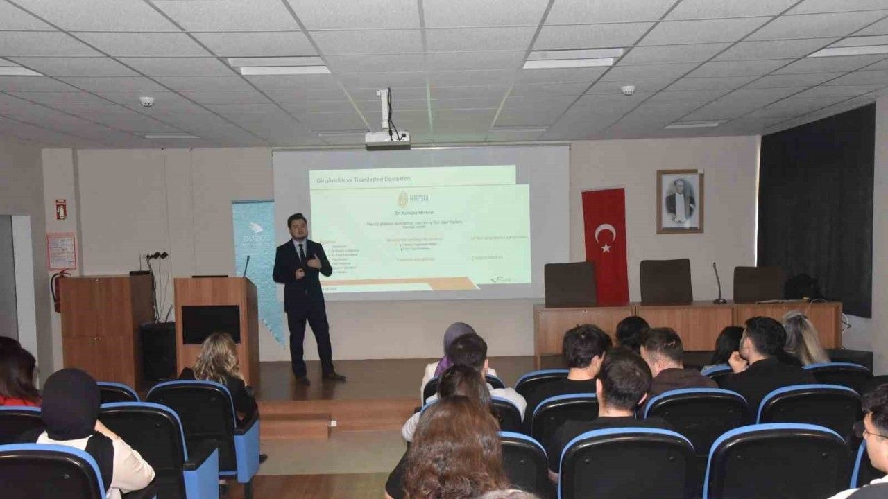 Düzce Teknoloji Transfer Ofisi Girişimcilik ve Ticarileştirme Destek Birimi Koordinatörü Selçuk Cantürk ise girişimcilik ve ticari destekler, Düzce Teknopark destekleri, Ön Kuluçka ve Kuluçka Merkezi, Ar-Ge Proje Pazarı, Girişimcilik Maratonu, Bireysel Genç Girişim Hızlandırma Programı ve TÜBİTAK destekleri hakkında bilgilendirmede bulundu. Henüz fikir aşamasında olan şirketleşmemiş iş fikirlerine Düzce Teknopark olarak destek verdiklerini belirten Selçuk Cantürk, "Mentörler tarafından geliştirdiğiniz fikrinizi şirketleştirip yatırımcılar ile görüşmelerinizi sağlayıp fikrinizin hayata geçmesini sağlıyoruz. Geçen yıl 14 fikir şirketleşerek hayallerini gerçekleştirdiler. 11 yıldır kesintisiz devam ettirdiğimiz Girişimcilik Maratonu’na sizler de fikirleriniz ile başvurabilir, hayallerinizi gerçekleştirebilirsiniz. Düzce Teknopark olarak fikirden pazara kadar yanınızdayız ve sizi desteklemeye devam edeceğiz" şeklinde konuştu.