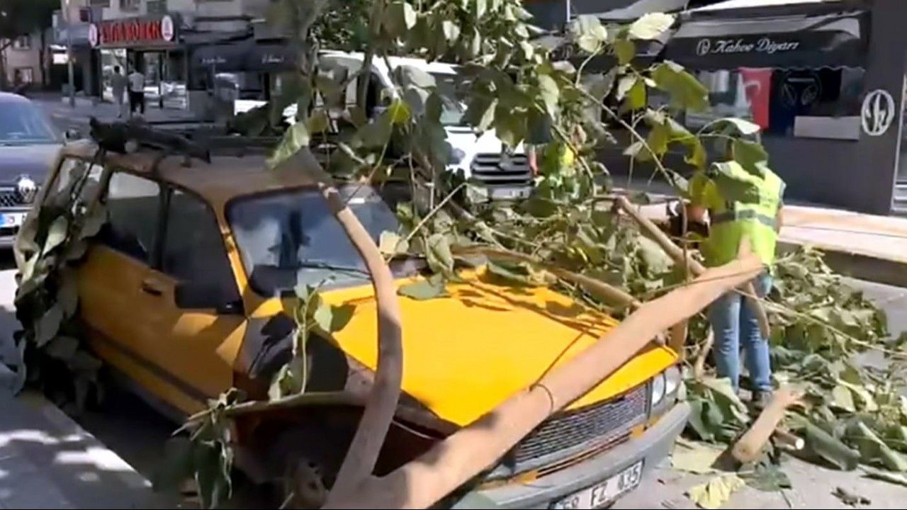 Aydın’ın Söke ilçesinde kırılan bir ağacın dalı park halindeki otomobilin üzerine düştü.
