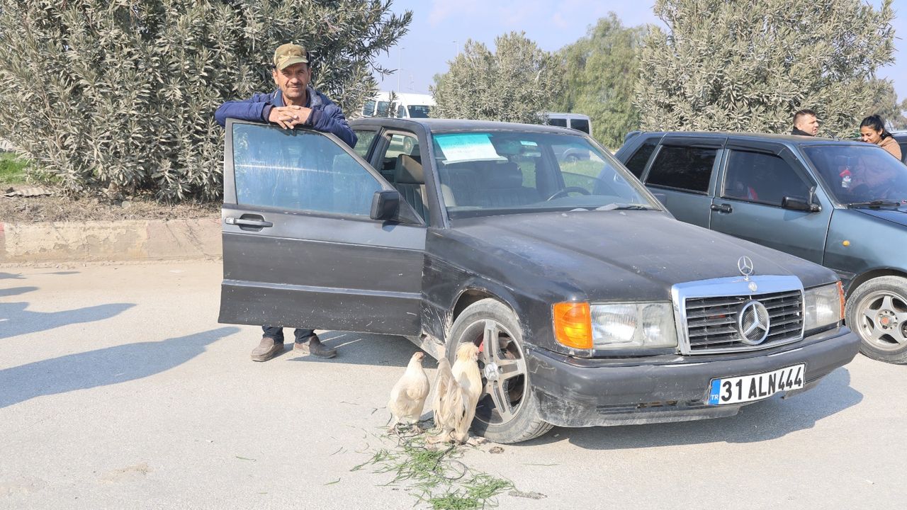 Hatay'da aracını satmak için araba pazarına getiren Mehmet Kuyucu, hobi olarak beslediği tavuğu ve horozunu da aracın tekerine bağlayarak aracıyla birlikte satışa çıkardı. Aracın tekerine bağlı hayvanlar görenlerin dikkatini çekerken Kuyucu, tavuk ile horoza 3 bin TL arabaya ise 260 bin TL'den müşteri bekledi.