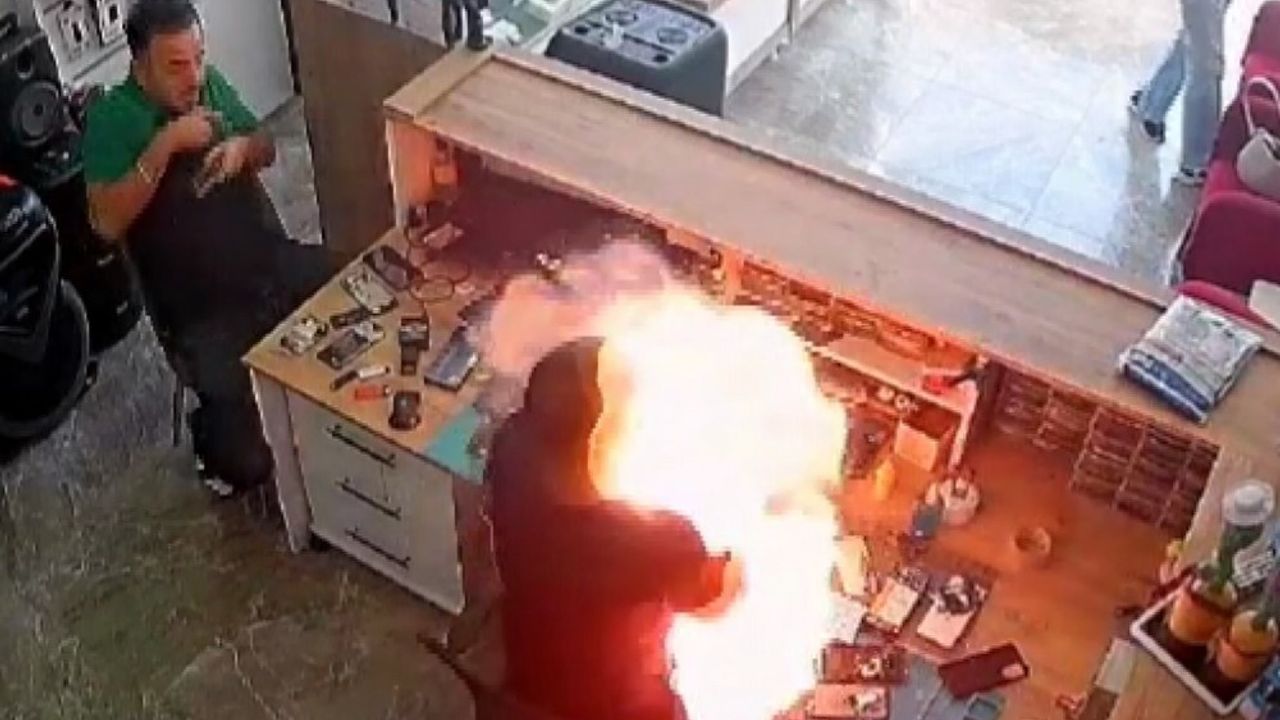 Aksaray’da telefonun bataryası değiştirmek isteyen tamircinin çıkartmaya çalıştığı batarya adeta bomba gibi patladı. Güvenlik kamerasına da yansıyan patlama yürekleri ağza getirirken, alev topu gibi patlayan batarya tamircinin vücudunda da yanıklara neden oldu.