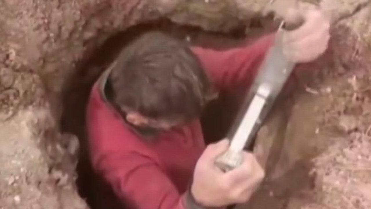 Sarıkaya ilçesine bağlı Burunkışla köyünde çiftçilik yapan Kamil Bayar’ın nohut ekimi yaptığı sırada traktörünün bıçağına taş takıldı. Takılan taşı kaldırırken taşın altında sığınak benzeri bir çukur olduğunu keşfetti. Bu anları cep telefonu kamerasıyla görüntüledi.