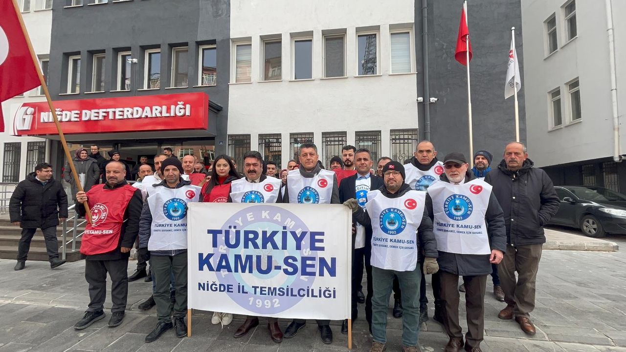 Türkiye Kamu-Sen tarafından “Ücrette hakkaniyet, vergide adalet” talebiyle Niğde Defterdarlığı önünde basın açıklaması düzenlendi. Türkiye genelinde eş zamanlı olarak yapılan açıklamada, kamu çalışanları ve emeklilerin yaşadığı ekonomik kayıplara dikkat çekildi.