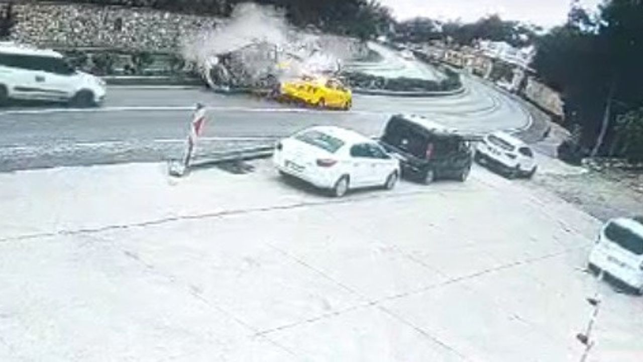 Yaşanan trafik kazası bir iş yerinin güvenlik kamerasına anbean yansıdı. Görüntülerde virajı alamayan otomobilin önce refüje çarpması ve ardından karşı şeride geçerek taksi ve diğer araçla çarpışması yer alıyor.