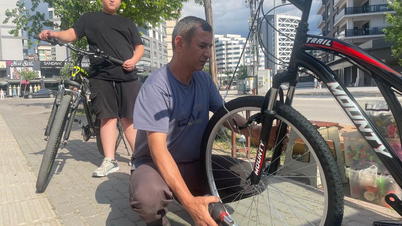 Hava basmanın 10 lira, lastik tamirinin 100 lira olduğunu anlatan Aktürk, "Fren bakımı parça değişmezse 50 lira. Yeni alınmış bir bisiklet toplama, ayarlarını yapma 300 lira, vitesli ise 500 lira. Bazen geç saatlere kadar çalışıyoruz." dedi.