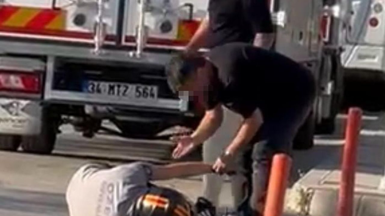 İzmir'de iddiaya göre trafikte yol verme nedeniyle motosiklet ile otomobil sürücüsü arasında çıkan tartışma kavgaya dönüştü. Motosiklet sürücüsünün 2 kişi tarafından yerde tekmelendiği anlar ise cep telefonu kamerasına yansıdı.