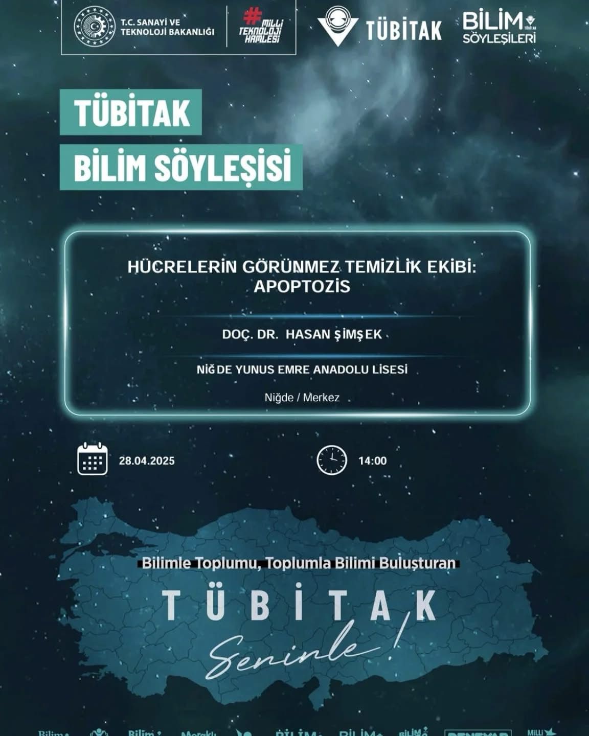 Konusunun Hücrelerin Görünmez Temizlik Ekibi: Apoptozis olacak etkinlik 28 Nisan’da saat 14:00 da başlayacak. Niğde İl Milli Eğitim Müdürlüğü, bu başarıdan dolayı okul yönetimini, öğretmenleri ve öğrencileri tebrik ederek, bilimsel etkinliklere verilen desteğin artarak devam edeceğini belirtti.