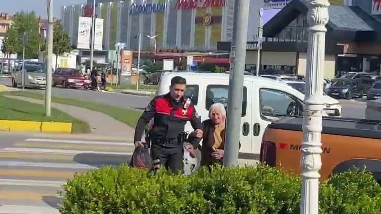 Polislerin yardımıyla yaşlı kadın güvenli bir şekilde yolun karşısına geçti.