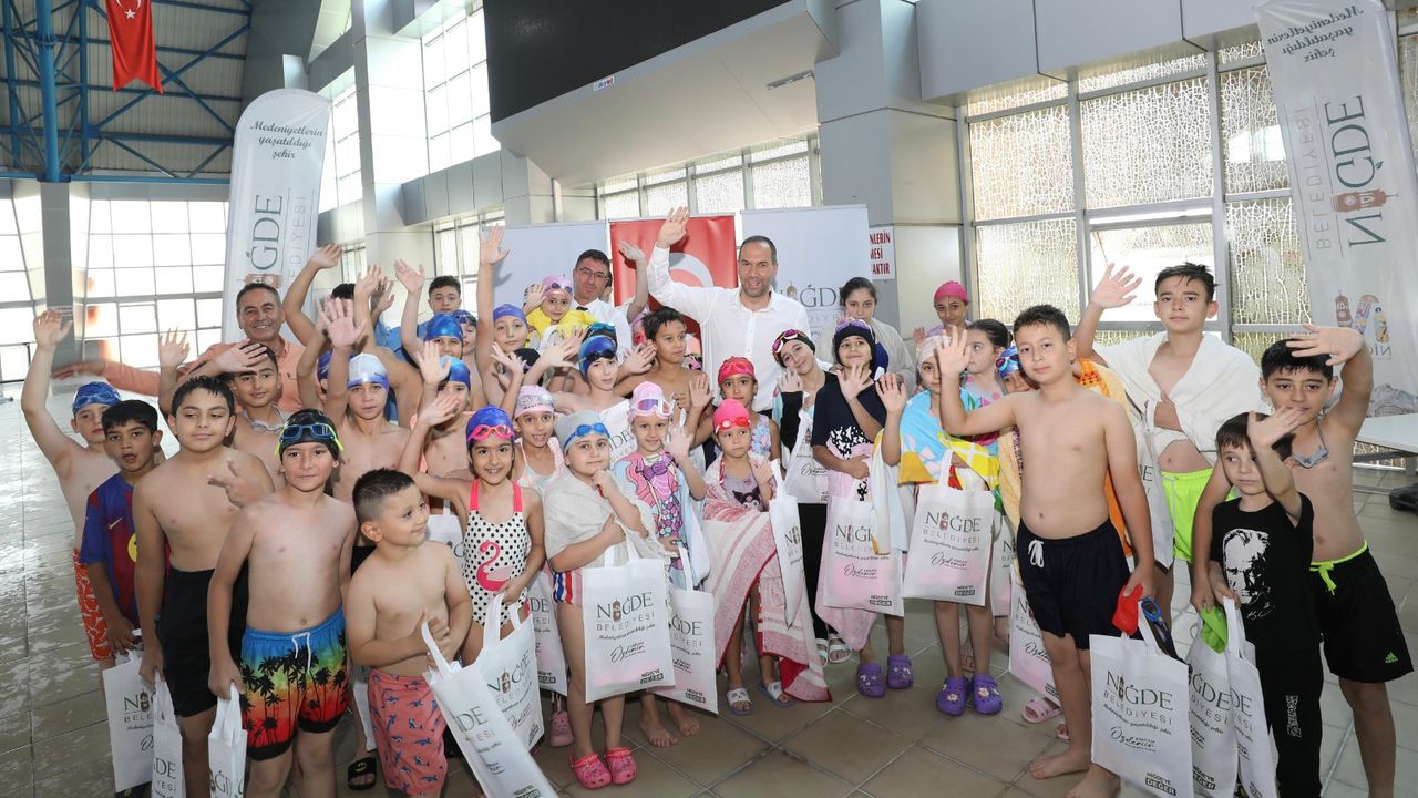 Niğde Belediyesi, çocukların spora teşvik edilmesi ve sağlıklı gelişimlerine katkı sağlanması amacıyla düzenlediği Yaz Spor Okulları kapsamında yüzme eğitimi alan çocuklara yüzme bonesi ve yüzücü gözlüğü hediye etti.